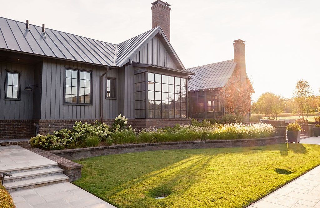 A welcoming front yard with a contemporary farmhouse exterior, featuring deep gray vertical siding paired with warm red brick. The sleek metal roof and large windows create an airy, modern aesthetic, allowing plenty of natural light to enter the home. The lush green lawn is spacious and well maintained, ideal for children to play safely. Raised brick flower beds filled with blooming white hydrangeas and ornamental grasses add curb appeal and a pop of color. The paved walkway and gently sloping steps ensure easy access for strollers or young children, making this space both practical and inviting for a family.