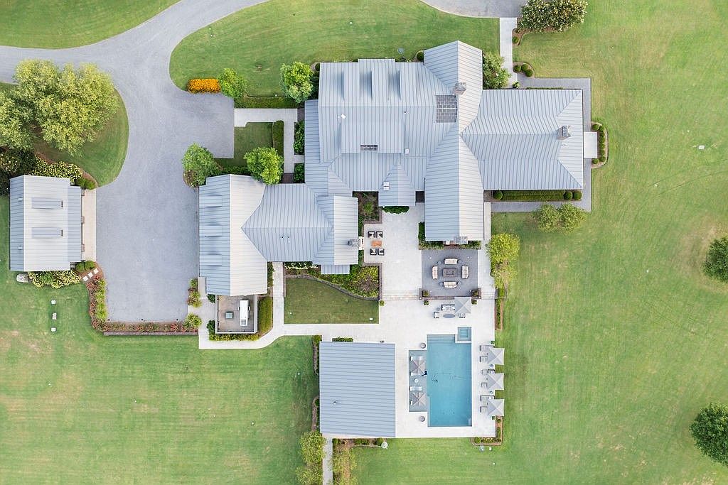 A spacious backyard layout features a large rectangular in-ground pool surrounded by a bright, paved patio perfect for gatherings and family play. Several outdoor seating areas with comfortable arrangements welcome relaxation and socializing. The home’s modern architecture is highlighted by clean metal roofs and soft gray tones, offering a cohesive look that feels both welcoming and elegant. Lush green lawns wrap around the property, providing plenty of space for children or pets to run and play safely. Shrubs and manicured landscaping create natural boundaries and add privacy, enhancing the family-friendly, serene environment.