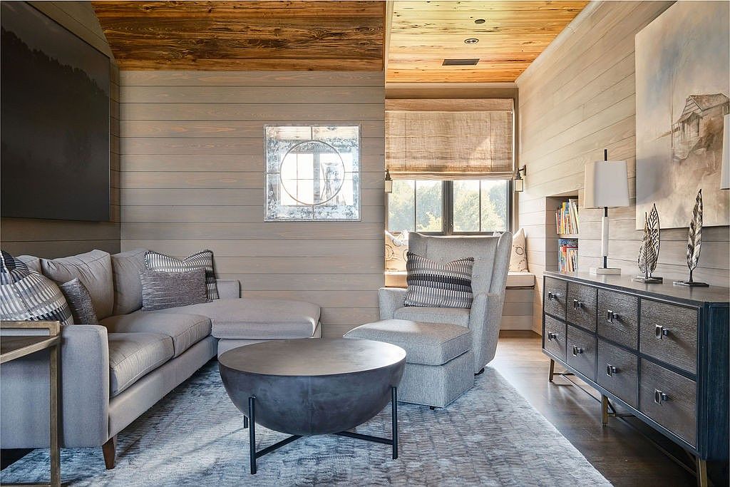 A comfortable family living room showcases an open, inviting layout with a large sectional sofa and a cozy upholstered armchair centered around a round coffee table. Neutral shades of grey and beige dominate the room, creating a warm modern atmosphere. The wood-paneled walls and ceiling add rustic charm, while a large soft rug enhances family-friendly comfort. There’s a window seat with built-in storage, ideal for reading or playtime, complete with nearby book shelving. Thoughtfully selected pillows and minimalist artwork add a welcoming touch, and sturdy furnishings ensure the space feels practical, stylish, and perfect for kids or gatherings.