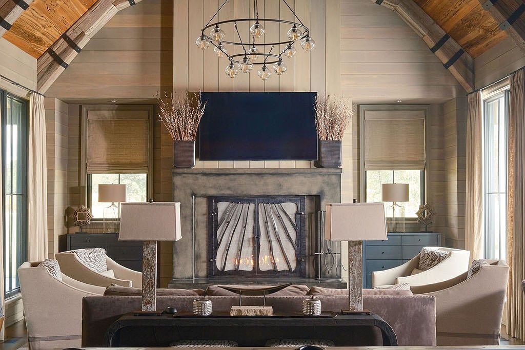 A spacious family living room features a dramatic vaulted ceiling with exposed wood beams and large windows on either side, filling the space with natural light. At the center, a sleek stone fireplace anchors the room, topped by a generous flat-screen TV and flanked by matching modern vases with tall dried branches. The seating arrangement is family-friendly with plush sofas and armchairs set in a sociable semicircle, ideal for gatherings or relaxing evenings. Neutral tones of beige, tan, and grey create a welcoming, cohesive color palette, while rustic wood accents and elegant metal lighting fixtures add warmth and contemporary charm. Soft textiles and cozy throws enhance comfort.