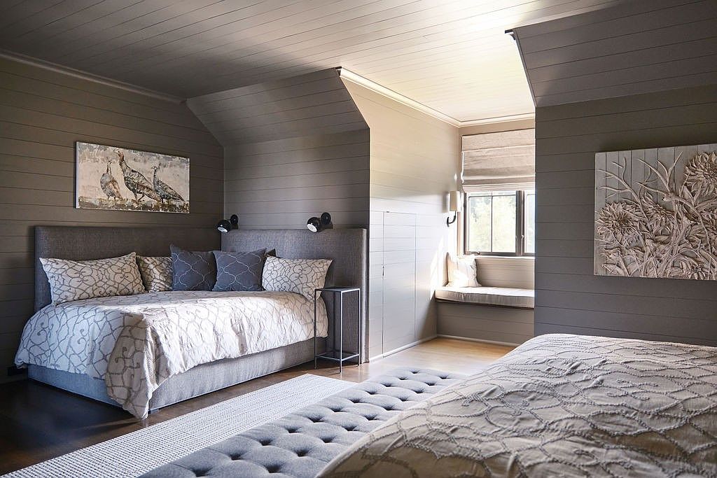 This inviting bedroom features two plush beds with elegant patterned bedding, making it ideal for a family or siblings sharing a space. The room’s soft gray walls and ceiling, along with coordinating tufted benches and accent pillows, create a soothing, contemporary feel. Shiplap paneling adds a touch of farmhouse charm, while sophisticated artwork above each bed offers a natural, calming aesthetic. A built-in window seat with cushions provides a cozy nook for reading or relaxing, bathed in natural light from the large window. The spacious layout and calming colors promote comfort, togetherness, and restful sleep.
