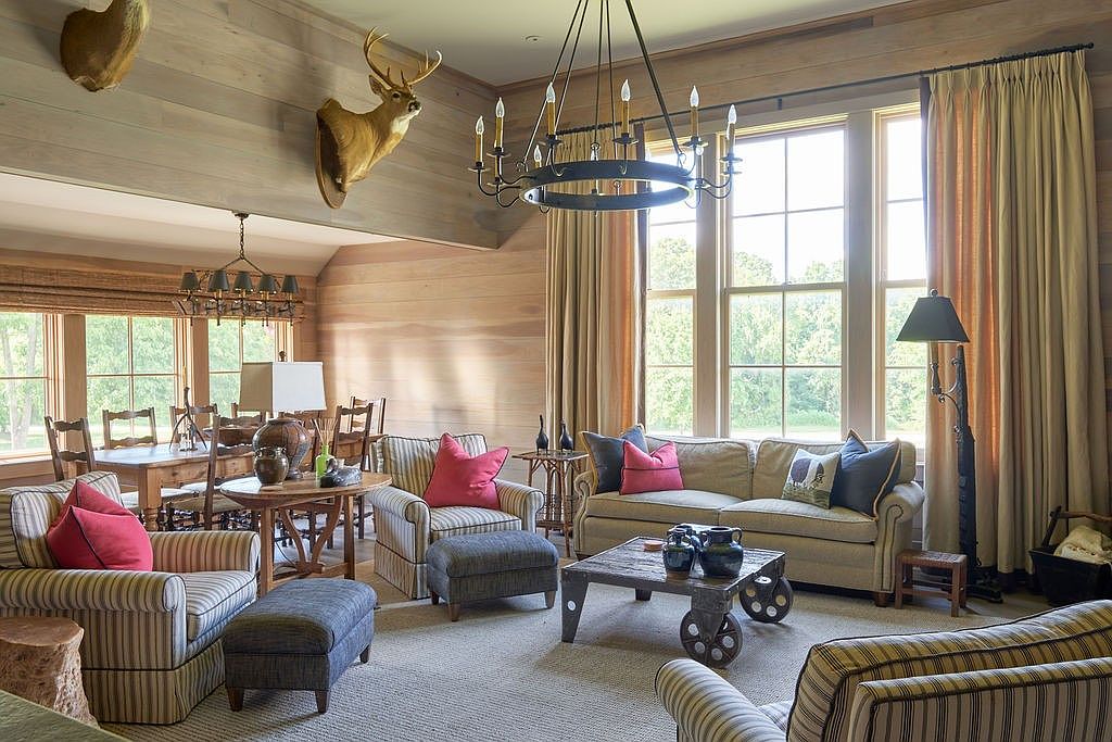 Spacious, light-filled living room with a warm, inviting atmosphere perfect for families. Three large, grid-style windows allow natural light to flood the space, highlighting the beige and tan color palette on the walls and curtains. Comfortable upholstered sofas and armchairs feature soft stripes and are accented with colorful throw pillows, adding a cozy touch. A rustic wood coffee table sits at the center, surrounded by ottomans for extra seating. Antler mounts and a wrought iron chandelier provide subtle lodge-inspired accents, while the adjoining dining area offers a seamless, open layout suitable for gatherings and family meals.