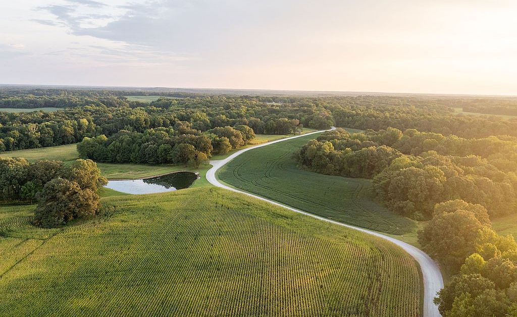 A winding driveway curves gracefully through expansive, lush farmland leading toward a peaceful home surrounded by mature trees. The scene is bathed in the gentle, golden light of early morning or evening, creating a warm and inviting atmosphere ideal for families seeking tranquility and space. The property features vast open fields, a reflective pond perfect for outdoor play or relaxing picnics, and a forested backdrop that adds privacy and the beauty of nature. The soothing green palette and wide-open skies offer a sense of freedom, making this a picturesque location for family living and outdoor lifestyle.