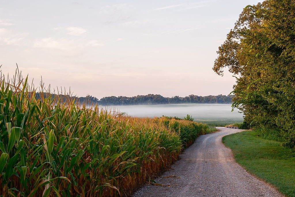 A winding gravel driveway curves gently through lush greenery, bordered on one side by tall, golden-green stalks of corn and on the other by mature, leafy trees. The drive leads toward open fields under a soft, early morning sky, with mist rising in the distance for a serene, peaceful atmosphere. The open space and natural surroundings make this setting ideal for families seeking privacy, relaxation, and outdoor activities. The inviting rural landscape is perfect for children to safely explore, play, and enjoy nature. The calm colors and expansive view evoke a sense of freedom and tranquility.