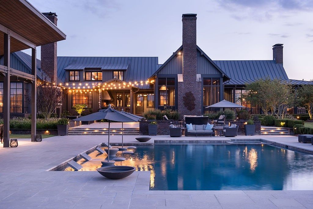 A spacious backyard pool area is set against the backdrop of a modern farmhouse-style home. The large swimming pool is surrounded by light stone decking, offering ample space for both children and adults to play or relax. Several lounge chairs and umbrellas provide shaded seating, while an inviting outdoor living space features comfortable sofas and armchairs arranged around a coffee table, ideal for family gatherings and entertaining. String lights are draped overhead, casting a warm, welcoming glow. Lush greenery, manicured bushes, and neatly placed planters add natural beauty, and multiple chimneys, large windows, and dark metal roofing give the house a contemporary yet cozy appeal.