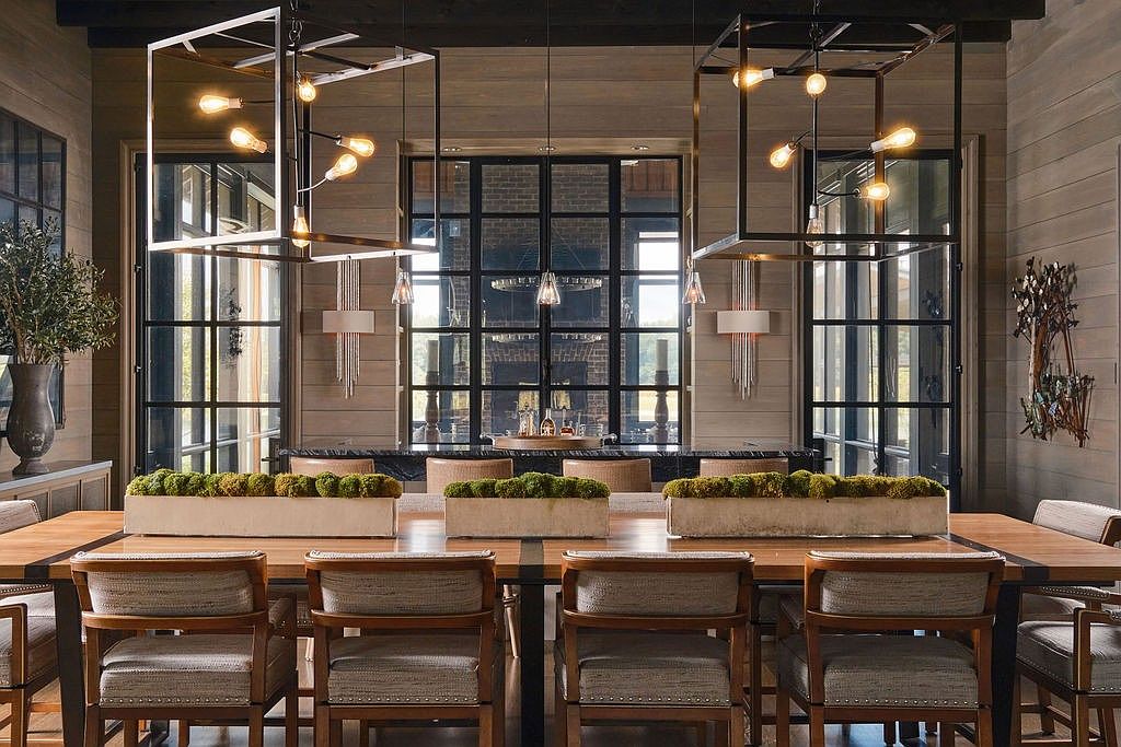 A spacious dining room features a long wooden table with seating for ten, making it ideal for family gatherings or entertaining guests. The chairs have soft, upholstered cushions and sturdy wooden frames for comfort and durability. Two large, geometric pendant light fixtures with exposed bulbs hang above the table, adding a modern touch. The room is bathed in natural light from expansive floor-to-ceiling windows with black frames, creating an open, airy feel. Walls are clad in light wood paneling, and leafy green decor in rectangular planters brings nature indoors. The muted neutral palette creates a warm and welcoming atmosphere that suits family life.