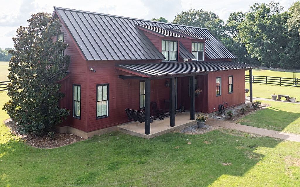 A welcoming front porch stretches along the entryway of a charming red American farmhouse with a modern metal roof. The covered porch is supported by sleek dark columns and provides enough space for several chairs, perfect for family gatherings or enjoying quiet afternoons. Multiple large windows allow abundant sunlight to fill the home, while the lush green lawn and surrounding open fields create a safe play area for children. Potted plants and subtle landscaping add warmth and curb appeal, and the peaceful tree-lined backdrop ensures privacy. The overall look blends rustic charm with practical family-friendly features.