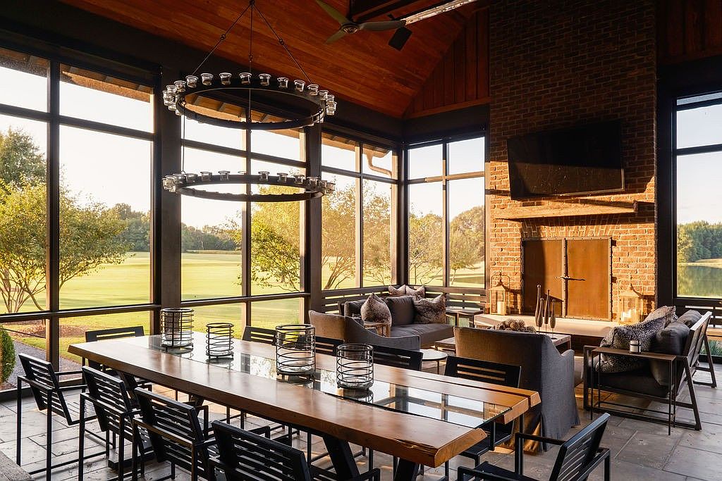 Spacious screened patio lounge featuring panoramic windows that provide stunning views of the green outdoors and ample natural light. A rustic brick fireplace with a mounted flat-screen TV serves as the room’s focal point, perfect for cozy family evenings. The area is furnished with a large wooden dining table and black metal chairs, ideal for gatherings and shared meals. Comfortable gray couches arranged around the fireplace create an inviting seating area. The earthy color palette, combining natural wood, brick, and slate flooring, adds warmth. Modern black circular chandeliers enhance the welcoming, family-friendly atmosphere, making it excellent for entertaining both adults and children.