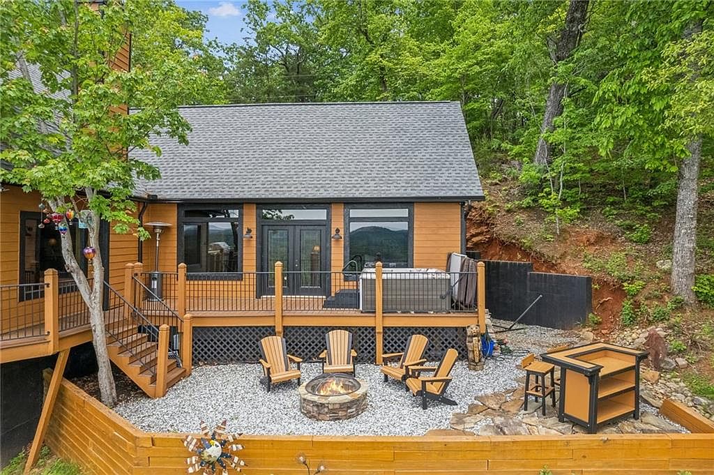 This inviting backyard space centers around a warm, stone fire pit, bordered by four Adirondack-style chairs placed on a bed of light gray gravel, encouraging cozy outdoor gatherings. Elevated above the patio, the wood deck features railings and two sets of black-framed French doors that connect the outdoor living area seamlessly to the home’s interior. The warm honey-toned wooden siding contrasts with the black trim and charcoal gray roof, harmonizing with the natural greenery surrounding the home. A built-in hot tub and a small serving station with stools enhance comfort and entertainment, creating a charming, rustic yet modern outdoor retreat nestled into the wooded hillside.