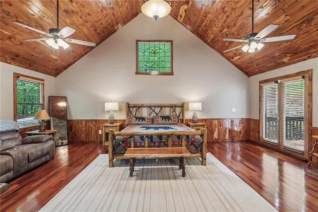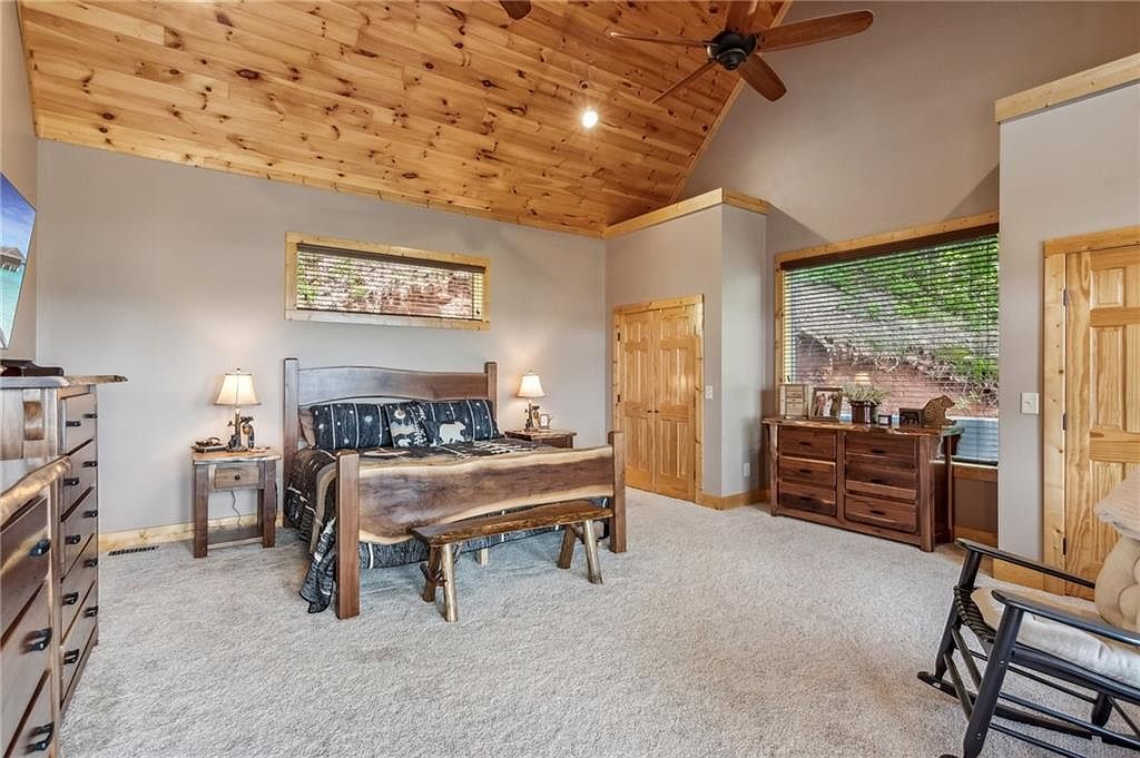 This master bedroom showcases a spacious layout with vaulted ceilings clad in warm, natural wood that enhances the rustic charm. Neutral light gray walls contrast softly with the wooden trim and furniture, creating a cozy yet open atmosphere. A large wooden bed with a natural, plank-style headboard is centered between matching bedside tables, each topped with a classic lamp. The carpeted floor adds a plush texture underfoot. Ample storage is provided by a wide dresser and closet doors made of matching wood. Large windows with blinds frame leafy views, completing the serene, lodge-like aesthetic.