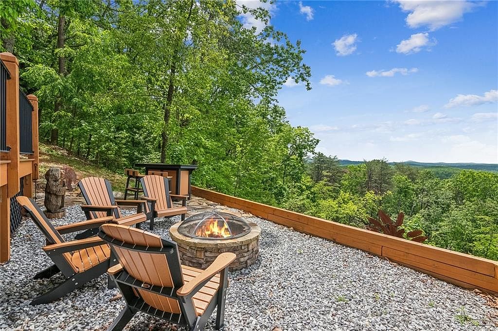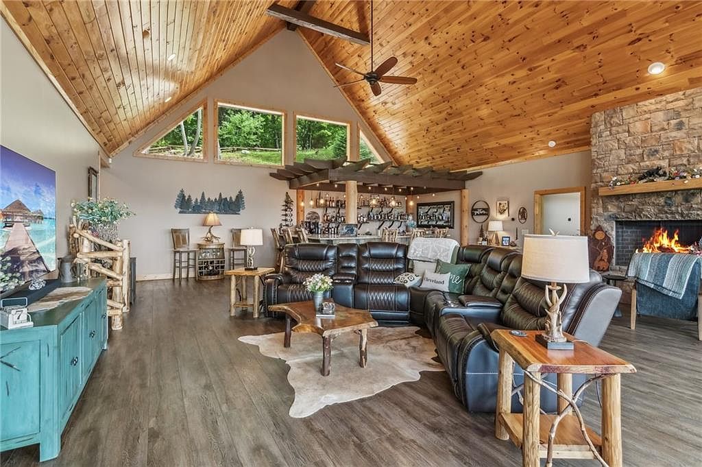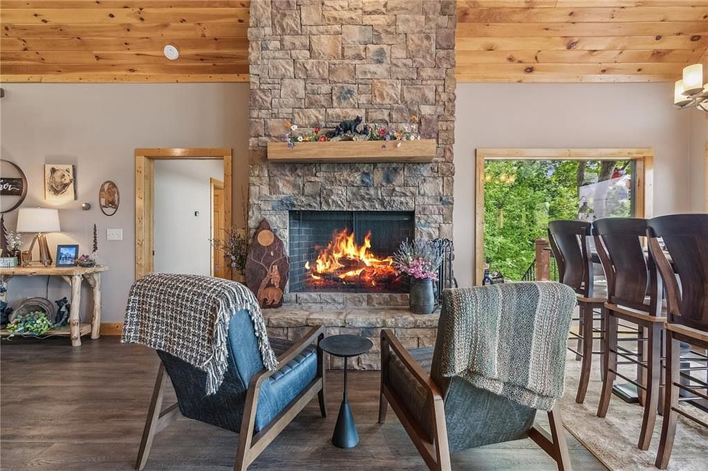 This stunning Chalet-style cabin is a perfect mountain retreat located in Cleveland, Georgia. Built with thoughtful craftsmanship, the home sits on a spacious 5.77-acre estate that includes two lots and over 500 feet of direct border with the Chattahoochee National Forest, offering unrivaled privacy and spectacular mountain views visible through impressive floor-to-ceiling windows. The home features rich wood finishes and towering tongue-and-groove ceilings combined with four beautiful stacked-stone fireplaces, creating a warm and inviting atmosphere. Outdoor living spaces are abundant with expansive decks, an outdoor kitchen, dining area, a hot tub under the stars, and a cozy stone fire pit, all designed to maximize enjoyment of the beautiful mountain setting. Located conveniently near local attractions such as wineries, breweries, hiking trails, fishing spots, and the quaint alpine village of Helen, this property offers both luxury and natural beauty. Listed at $1,195,000, this mountain estate combines comfort, privacy, and breathtaking views for the ultimate mountain experience.