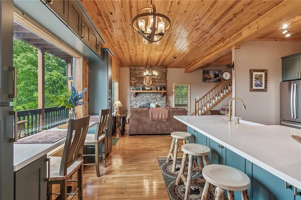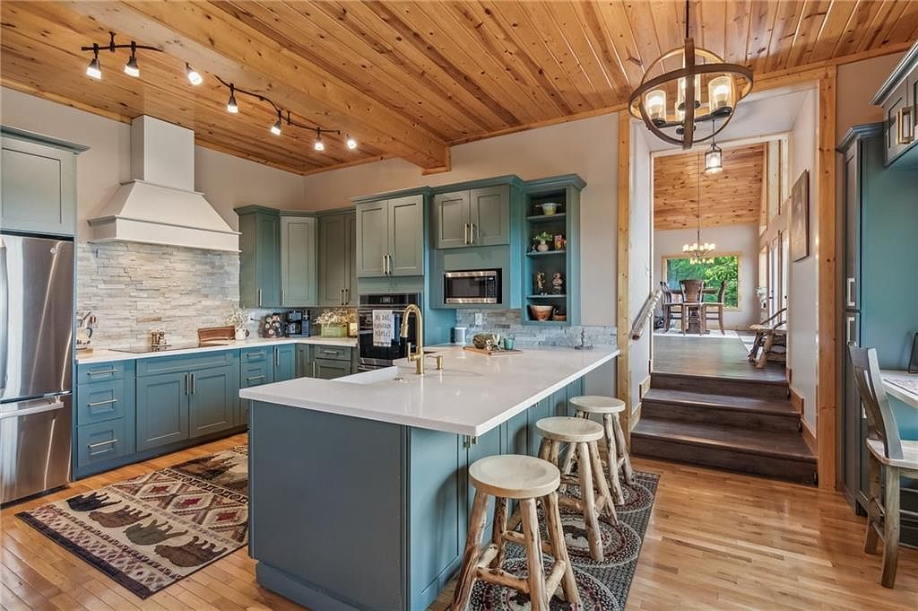 This kitchen features a warm and inviting rustic-modern design highlighted by a natural wood ceiling with exposed beams and warm hardwood flooring. The custom cabinetry is painted in a muted teal tone, complemented by sleek brass hardware, creating a stylish and cohesive look. A generous white quartz countertop island includes an integrated sink and brass faucet, paired with three natural wood stools featuring a live edge design, perfect for casual dining or entertaining. The backsplash is crafted with white stone tiles arranged in a horizontal pattern, adding texture and brightness. Track lighting and a farmhouse-style hanging light fixture enhance both functionality and charm. Through the doorway, a raised dining area can be seen, maintaining natural wood elements and an open, airy flow between the spaces.