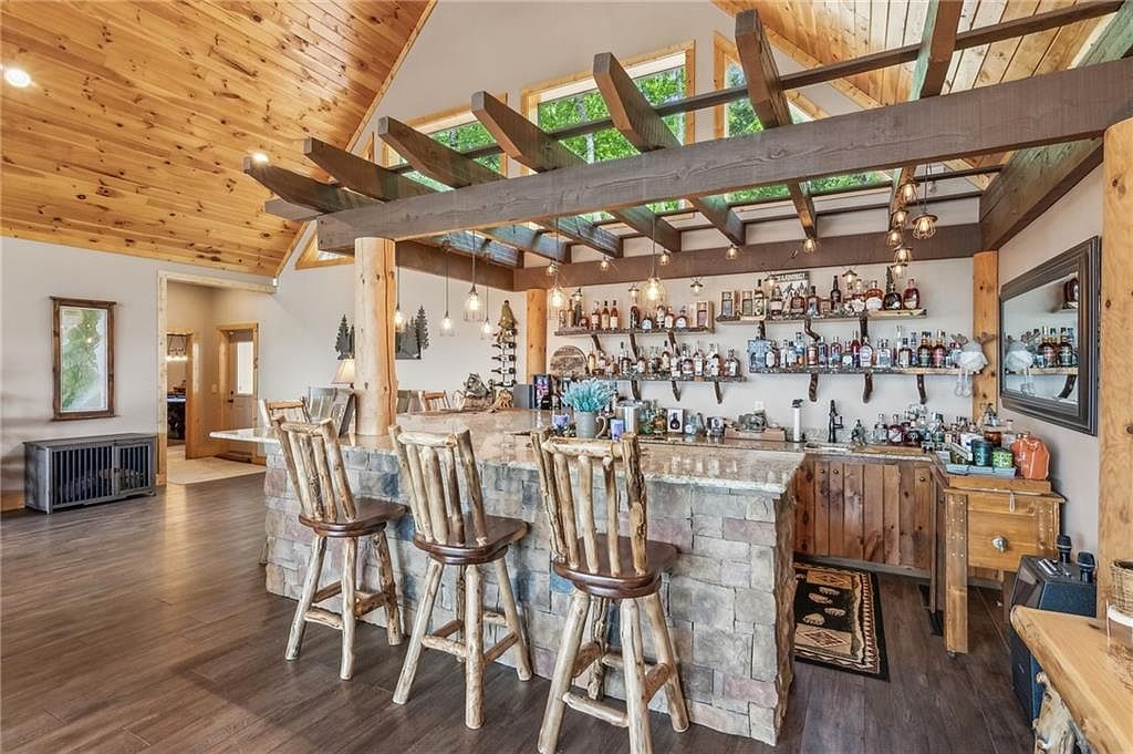 This cozy home bar combines natural wood and stone elements for a warm, rustic ambiance. The bar counter features a stacked stone facade complemented by a polished stone countertop. Four sturdy wooden bar stools with log-style backs line the bar. Above, exposed dark wooden beams support hanging pendant lights with warm bulbs, creating inviting illumination. Behind the bar, open wooden shelves display an extensive collection of spirits. The ceiling is clad in knotty pine wood paneling, adding warmth to the space. The dark wood flooring contrasts nicely with light walls and natural wood accents, blending rustic charm with modern functionality.