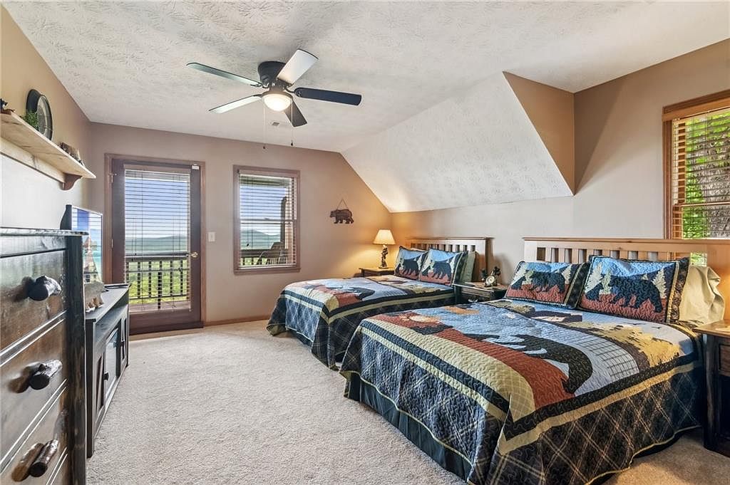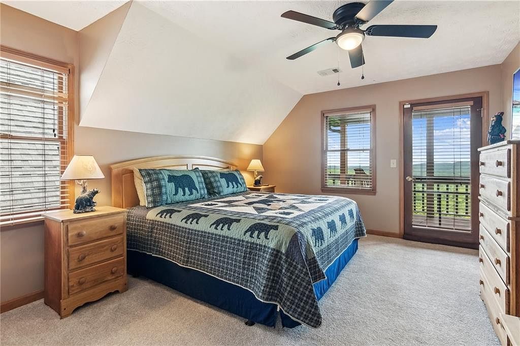 This warm bedroom features a sloped ceiling and plush light beige carpeting that enhances its inviting atmosphere. A large wooden bed with a charming bear-themed quilt and matching pillows anchors the space, while two wooden nightstands with simple lamps add a rustic touch. Natural light streams through the wood-framed windows with blinds, contributing to the airy feel. A ceiling fan with a light hangs centered above for comfort. A wooden dresser occupies one corner, and a glass door beside a window on the far wall leads to a balcony with an expansive view, adding an outdoor connection to the room.
