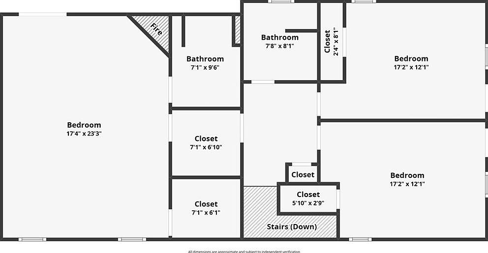 This upper floor features a well-planned arrangement with three bedrooms and two bathrooms. A large primary bedroom spans 17’4″ by 23’3″ and includes a nearby bathroom and two spacious closets. Two additional bedrooms measure 17’2″ by 12’1″ each, positioned on the opposite side of the floor with a shared bathroom and closets positioned centrally. The layout also includes multiple closets and a stairwell leading downstairs, maximizing storage and accessibility. The floor plan emphasizes balanced proportions with clear room delineations, offering both private and shared spaces for family living.