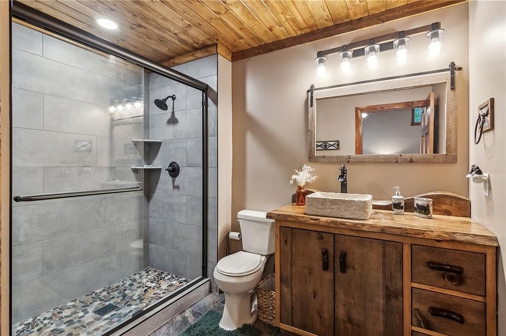 This bathroom combines rustic charm with modern functionality. The ceiling features natural wood planks that add warmth and character, complementing the wooden vanity with its rough-hewn texture and dark metal handles. A stone vessel sink sits atop the wood countertop, paired with a matte black faucet for a contemporary touch. The walk-in shower boasts large gray tiles with a pebble stone floor, bordered by a sleek black metal frame and matching shower fixtures. Neutral beige walls and soft lighting above the mirror create a cozy, inviting atmosphere, while practical shelving in the shower and a woven basket enhance organization.