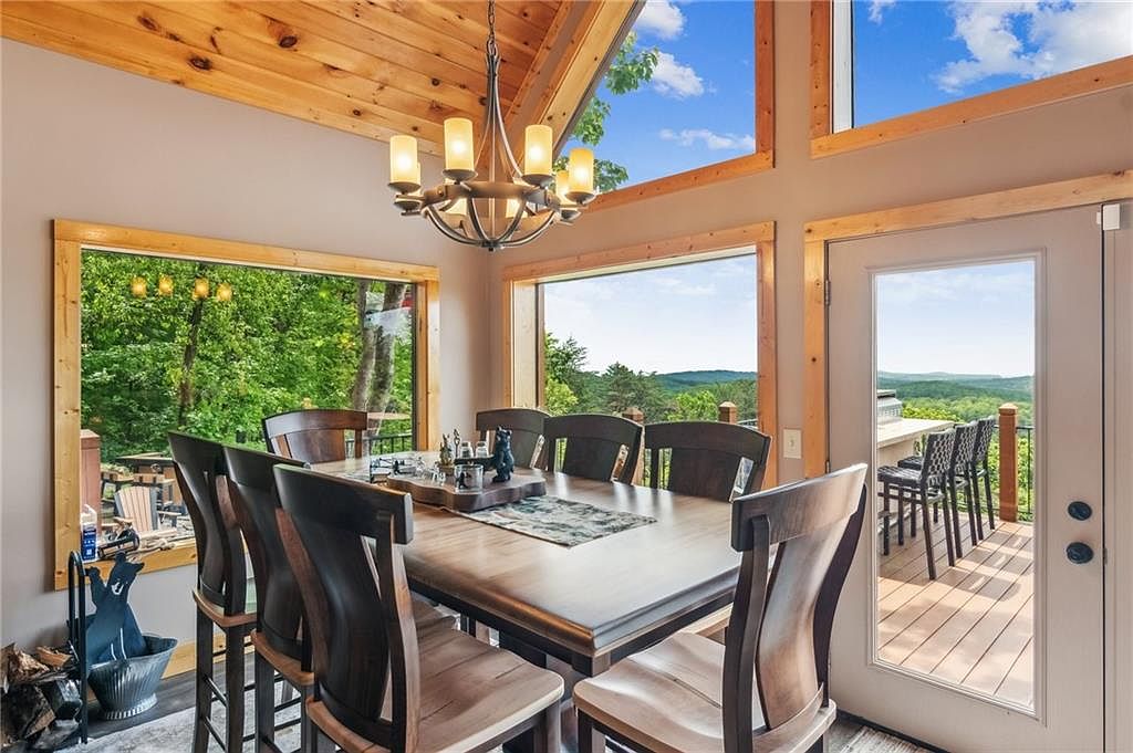 This bright dining space features a wooden table surrounded by six high-back chairs, all in dark rich wood tones that complement the natural wood accents framing the windows and ceiling. The ceiling is vaulted with wood paneling that enhances the cabin-like warmth of the room. Large windows on two sides offer panoramic views of lush greenery and distant hills, bringing the outdoors inside and flooding the room with natural light. A wrought iron chandelier with candle-style lights hangs above the table, adding rustic elegance. A glass door opens to a deck with bar stools, ideal for enjoying the stunning vista.