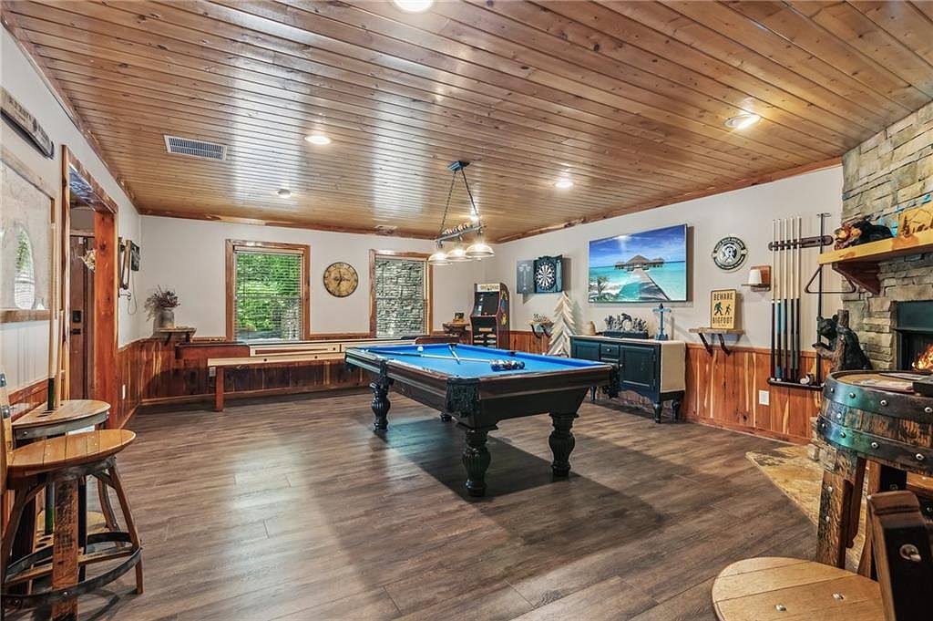 This spacious game room features a warm, rustic aesthetic with wood-paneled walls and a matching wood-plank ceiling. A classic black pool table with a vibrant blue felt top anchors the center of the room, illuminated by a rectangular overhead light fixture. The flooring is a rich, dark wood laminate, complementing the wood trim around the windows. The room boasts a stone fireplace with a wooden mantel, adding cozy charm alongside a barrel-style table and stools. Games like darts and shuffleboard highlight the entertainment focus of this room, enhanced by colorful wall art and a welcoming atmosphere.