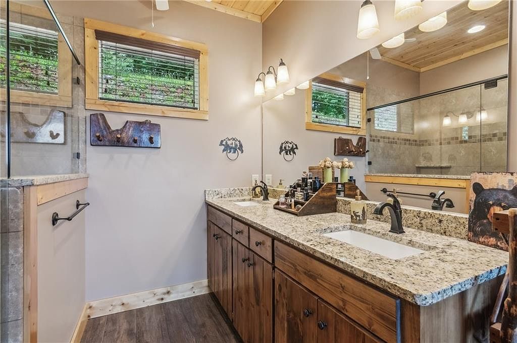 This bathroom features a spacious vanity with a long granite countertop, accommodating dual under-mount sinks and oil-rubbed bronze faucets. The cabinetry below is crafted from rustic wood, complementing the warm tones of the wood trim around the windows and the ceiling, composed of natural wood planks. A large mirror spans the length of the vanity, amplifying light from the window above and a row of warm, multi-bulb vanity lights. A walk-in tiled shower with glass partition is visible, continuing the beige and natural stone color scheme. The dark wood flooring contrasts softly with the lighter wall color, tying rustic charm with modern functionality.