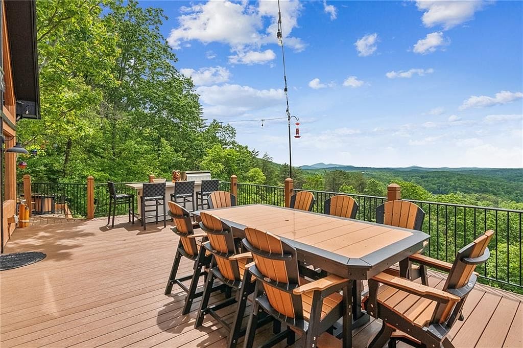 This expansive outdoor deck offers an inviting space for dining and socializing while overlooking a scenic forested landscape with distant hills. The deck floor features warm-toned wood planks that complement the natural surroundings. Central to the space is a large rectangular dining table accompanied by eight matching chairs with wooden slats and dark frames, blending comfort with rustic charm. Along one side, a bar-height table with stools provides an alternative seating area, ideal for casual gatherings. String lights hang above, hinting at cozy evening ambiance. Black metal railings ensure safety without obstructing the panoramic view of the lush greenery and bright blue sky.