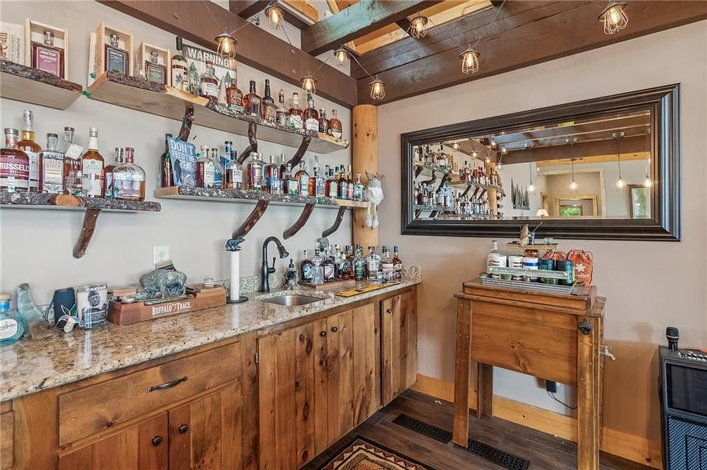 This cozy home bar showcases warm, natural wood cabinetry with distinctive grain patterns, creating a rustic yet polished feel. A granite countertop spans the length of the bar and features a small sink with a matte black faucet, perfect for mixing drinks. Above, two sturdy wooden shelves supported by curved metal brackets display an extensive collection of liquor bottles, adding color and personality to the space. The ceiling’s exposed wooden beams add architectural interest and complement the earthy tones throughout. A large black-framed mirror reflects the bar area, enhancing the room’s depth and light. Industrial-style pendant lights hang from the ceiling, casting a warm glow and contributing to the inviting ambiance.