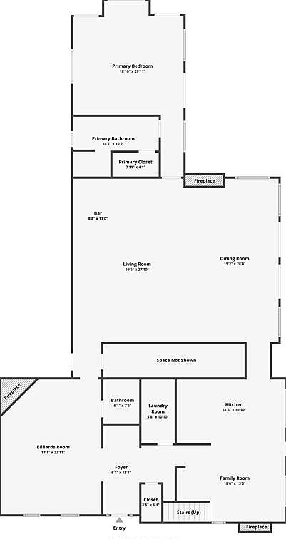This floor plan presents a spacious and well-organized home layout emphasizing open living spaces and multiple functional areas. The large living room and adjoining dining room occupy the central portion, featuring a fireplace that adds warmth and a cozy focal point. To one side, a bar area creates an inviting space for socializing. The primary bedroom, set apart for privacy, includes its own bathroom and closet. Additional rooms include a billiards room, a family room with another fireplace, a kitchen conveniently located near the dining area, and practical spaces such as laundry and bathrooms near the entry and stairs. The layout balances entertaining with everyday living, framed by thoughtful spatial flow and clearly defined zones.