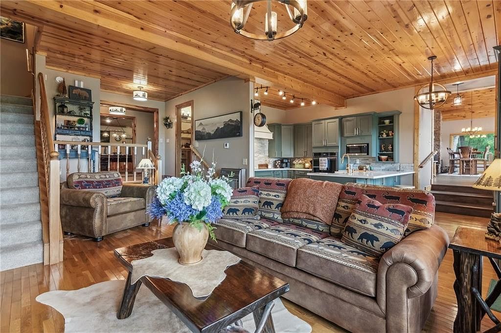 This inviting space combines a rustic family room with an open-concept kitchen. The warm wooden floors and knotty pine ceiling establish a cozy, cabin-inspired atmosphere. A large leather sofa and armchair embrace a natural wood coffee table atop an animal-hide rug, with cushions patterned in bear silhouettes complementing the outdoorsy style. The kitchen features muted teal cabinetry paired with white marble countertops, creating a subtle contrast. A stone range hood and modern fixtures seamlessly blend rustic charm with contemporary convenience. The dining area in the background is elevated by a few steps, maintaining an open but defined flow between spaces.