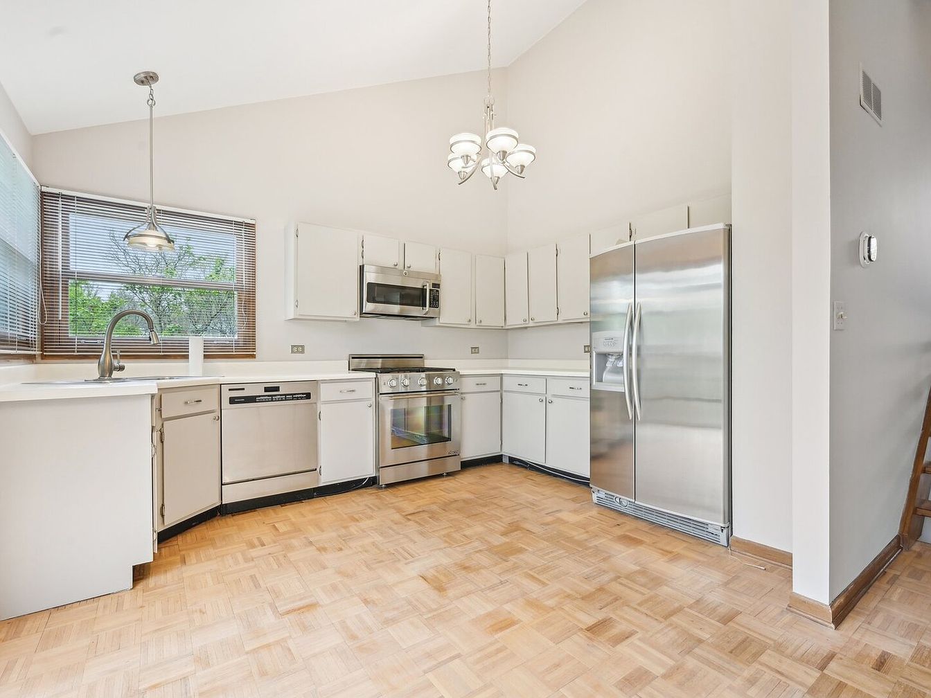 This spacious kitchen features a U-shaped layout with a warm wooden parquet floor that contrasts nicely with the clean, white cabinetry. Stainless steel appliances including a side-by-side refrigerator, dishwasher, microwave, and a stove are seamlessly integrated, adding a modern touch. Large windows with horizontal blinds allow plenty of natural light to brighten the space. The white countertops and walls maintain a bright and airy feel, while a brushed nickel pendant light over the sink and matching chandelier provide elegant lighting options. The overall design balances functionality with a simple, timeless aesthetic.