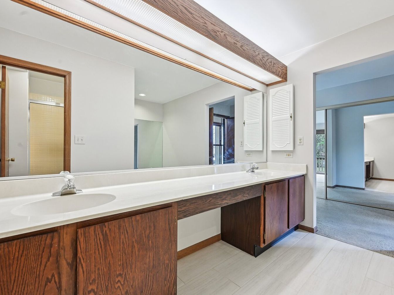 This bathroom vanity area features a long countertop with an integrated sink on one end, supported by dark wooden cabinetry that adds warmth and contrast to the space. A large mirror spans the entire length of the wall above the counter, reflecting light and enhancing the openness of the room. Above the mirror, a built-in wooden light fixture with a frosted cover provides soft, even illumination. The flooring is a light, neutral tile, complementing the white countertop and walls. Two louvered cabinet doors are mounted beside the mirror, likely hiding storage or a medicine cabinet. The space flows directly into an adjacent room with carpeted flooring and a sliding mirrored closet door, creating a sense of continuity in this mid-century inspired home.