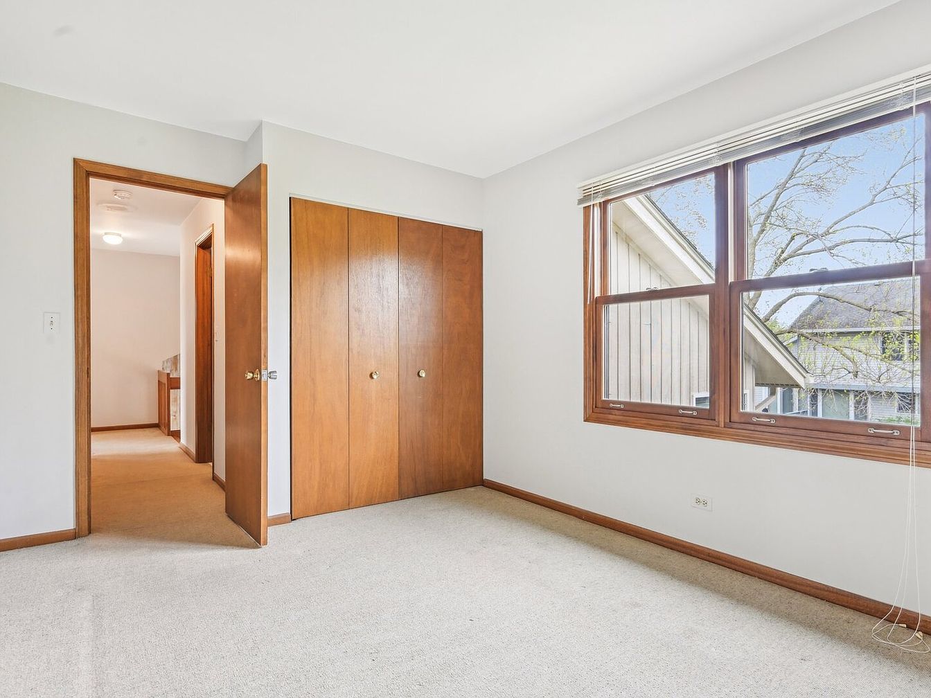 This bedroom features a simple and functional layout with clean, neutral tones that create a calm atmosphere. Soft beige carpeting covers the floor, complementing the off-white walls. A large window with wooden framing allows ample natural light to fill the room while offering a view of the outdoors. The wooden closet doors and the matching door to the hallway add warmth with their rich wood finish and round brass knobs. The trim around the doors and baseboards echoes the wood’s color, providing cohesive design elements throughout this cozy, inviting space.