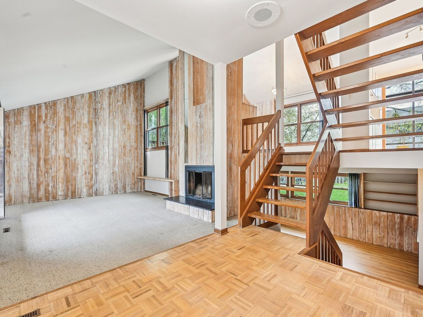 This living room presents a rustic yet airy ambiance featuring light wood paneled walls with a weathered finish that adds texture and warmth. The room transitions from a light beige carpeted area to a parquet wood floor, creating visual separation between spaces. A black-framed fireplace with a minimalist hearth centers one wall, framed by a tall vertical mirror that enhances the room’s height. Large mullioned windows allow abundant natural light to flood in, complementing the open wood staircase with its clean lines and matching wood railings. The staircase connects multiple levels, embracing an open concept that blends architectural interest with cozy charm.