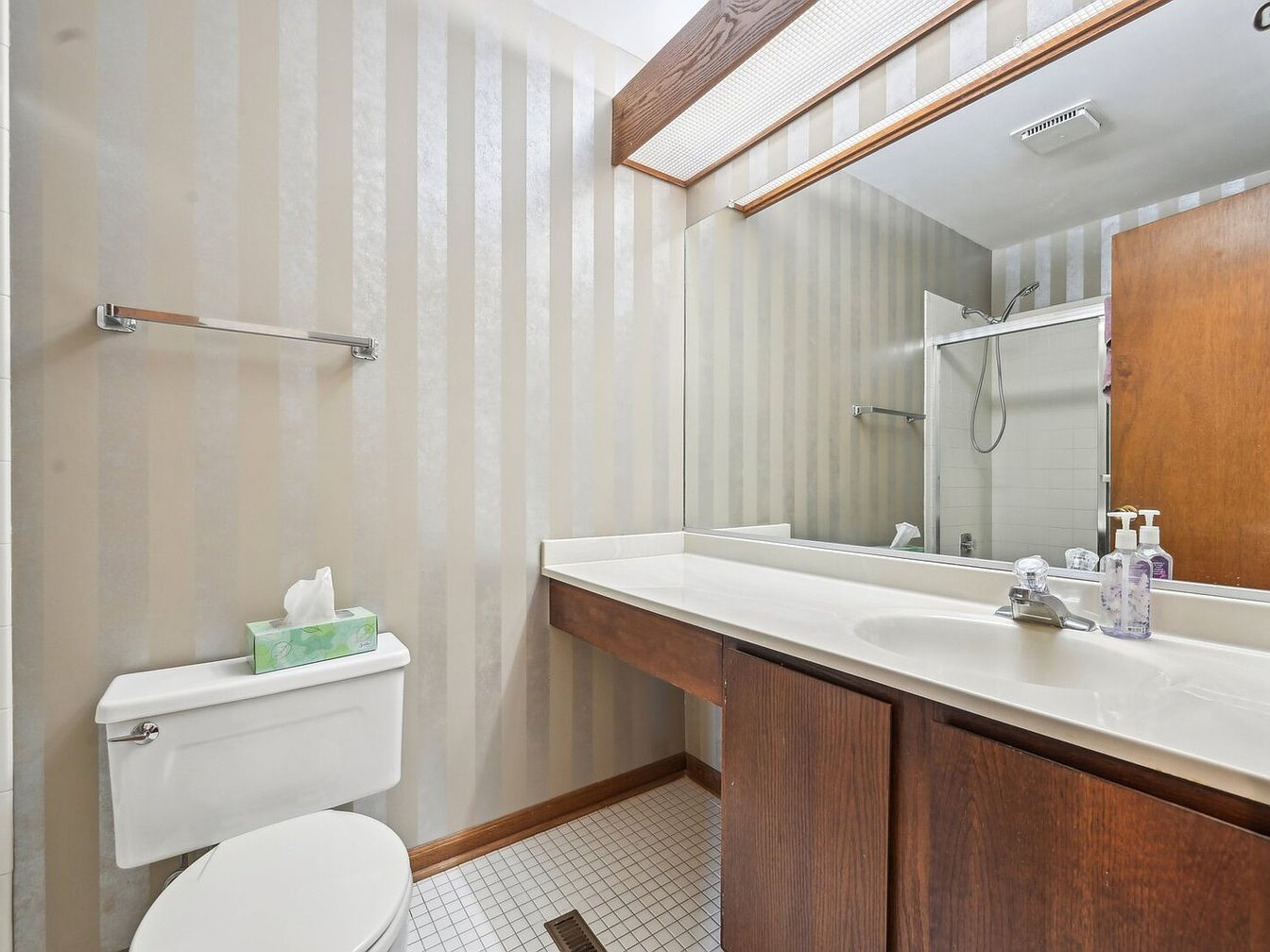 This bathroom features a crisp white toilet topped with a green floral tissue box, positioned next to a broad countertop with a single sink. The vanity showcases warm wood cabinetry beneath a glossy white surface, complemented by a large mirror that extends the length of the counter. The walls are adorned with subtle vertical stripes in muted beige tones, enhancing the room’s height. Above the mirror, a wooden frame encloses the overhead light. The tiled floor sports small square patterns in white, contributing to a clean and understated design. A towel bar sits empty above the toilet, and a shower area is partially visible through a glass door.