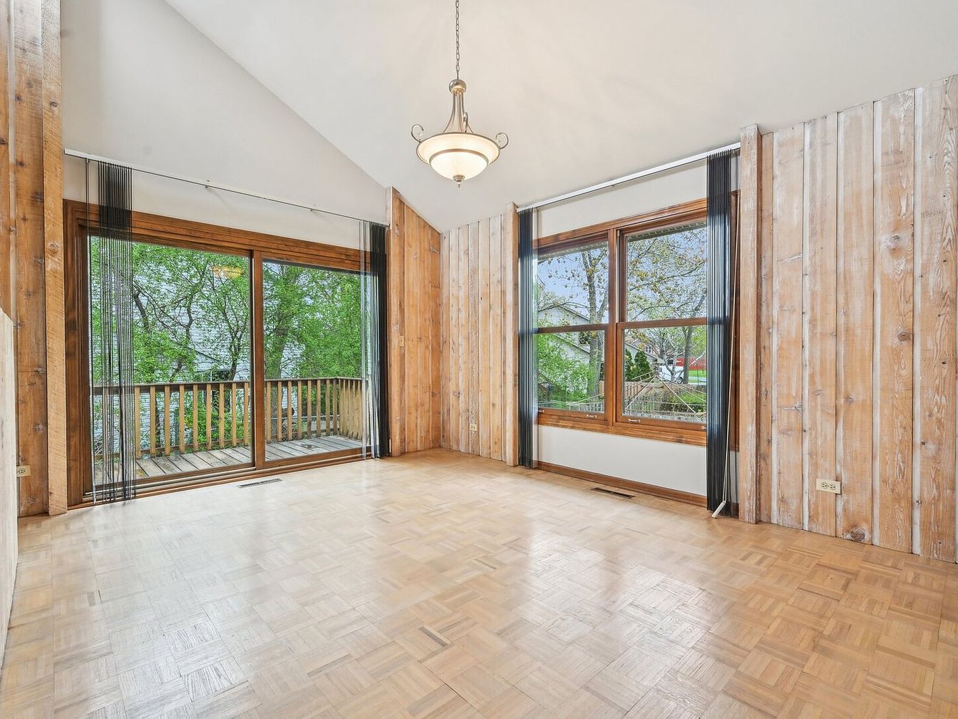 This bright sunroom features floor-to-ceiling sliding glass doors that open seamlessly onto a wooden deck, inviting abundant natural light and offering views of lush greenery. The walls are clad in vertical, light-toned wood planks with a softly weathered finish, paired with matching wood trim around the large window and sliding door. The parquet wood flooring adds texture underfoot, while a classic pendant light fixture with frosted glass hangs from the vaulted ceiling, creating a warm, inviting ambiance. Subtle vertical blinds frame the windows, enhancing privacy while preserving the airy feel of the space.