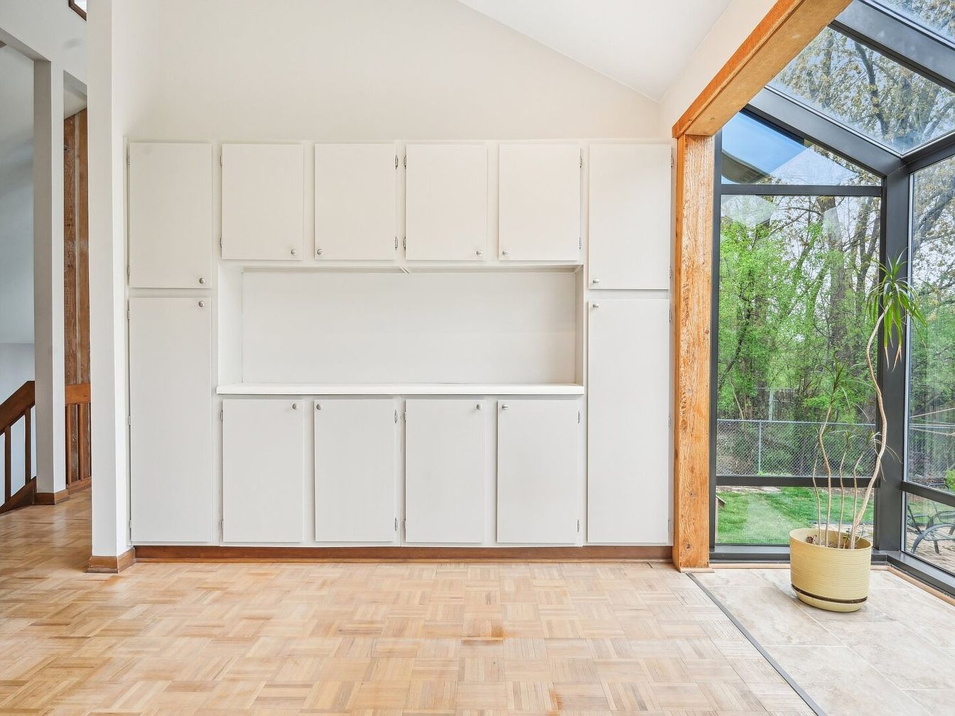 This space features a tall built-in storage wall with multiple white cabinets extending from floor to ceiling, creating a clean and organized look. The cabinetry presents simple, smooth panels with small round knobs, offering subtle functional elegance. The light hardwood parquet flooring adds warmth and texture, contrasting gently with the bright white cabinetry. To the right, a large floor-to-ceiling glass wall framed in natural wood allows abundant natural light and views of lush greenery outside, bringing a sense of openness and calm. The design emphasizes minimalism combined with practical storage and nature integration.