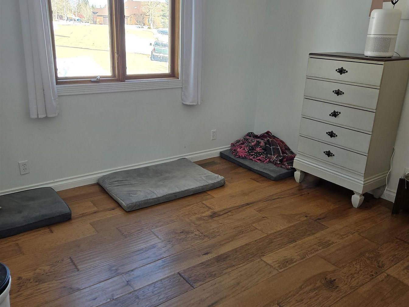 This simple nook features a warm, wooden floor with broad planks that bring rustic charm. Three soft cushions lay on the floor adjacent to a white-painted wooden dresser with decorative black handles, adding a vintage touch. A large window with wooden framing allows natural light to fill the space, softened by plain white curtains. The corner looks inviting and functional, likely used as a small seating or pet area. The clean and minimal color palette of greys, whites, and natural wood tones creates a calm and cozy ambiance.