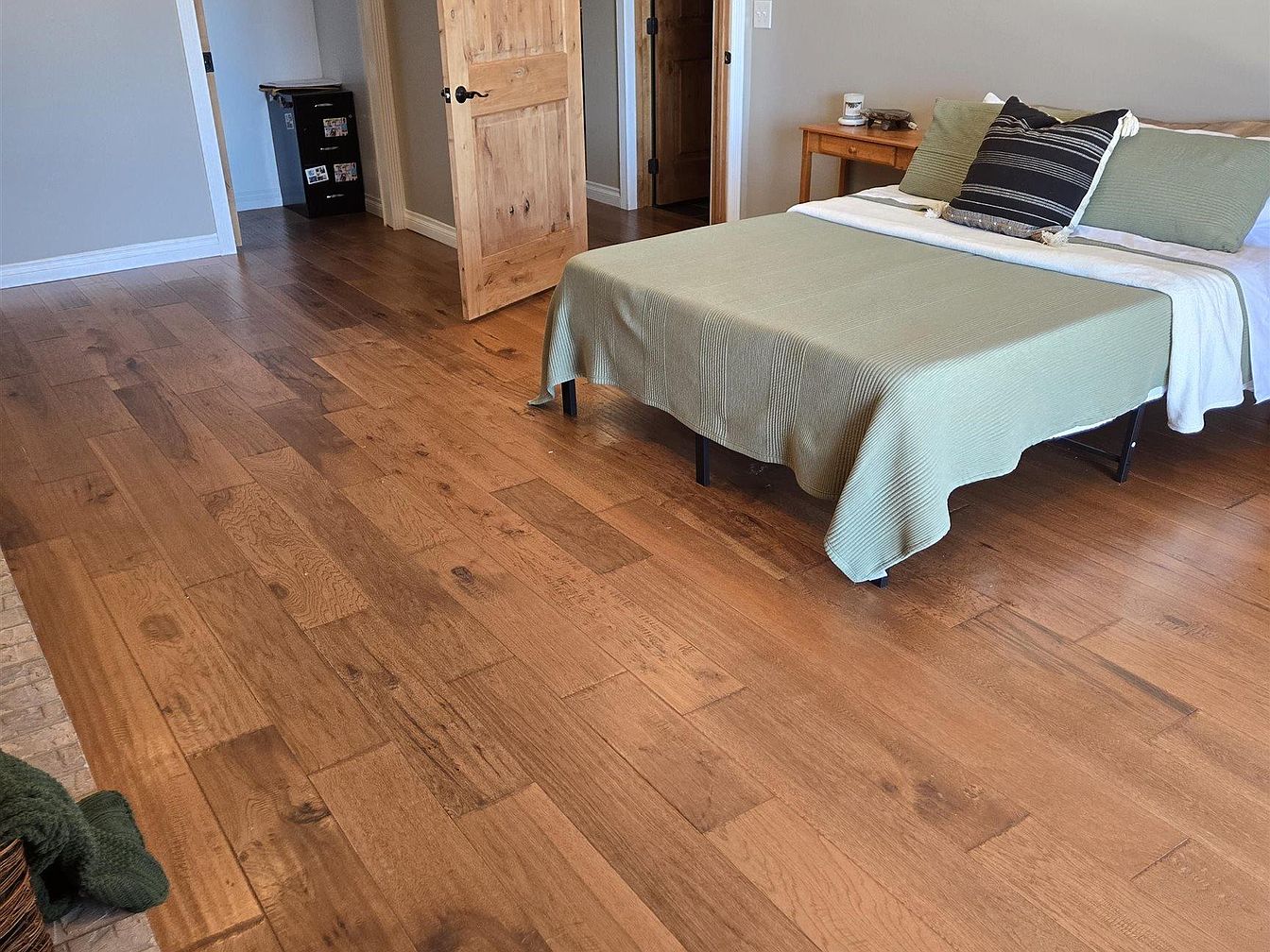 This cozy bedroom features rich, warm-toned wooden flooring with wide planks that bring a natural, rustic charm to the space. The bed is modestly covered with a soft, light green bedspread, complemented by two matching pillows and a black-and-white striped accent pillow, creating a calming, earthy color palette. A simple wooden side table beside the bed holds a candle and small decorative items, adding to the room’s understated warmth. The light-colored walls and natural wooden door with black hardware offer subtle contrast, enhancing the inviting and tranquil atmosphere of the bedroom area.