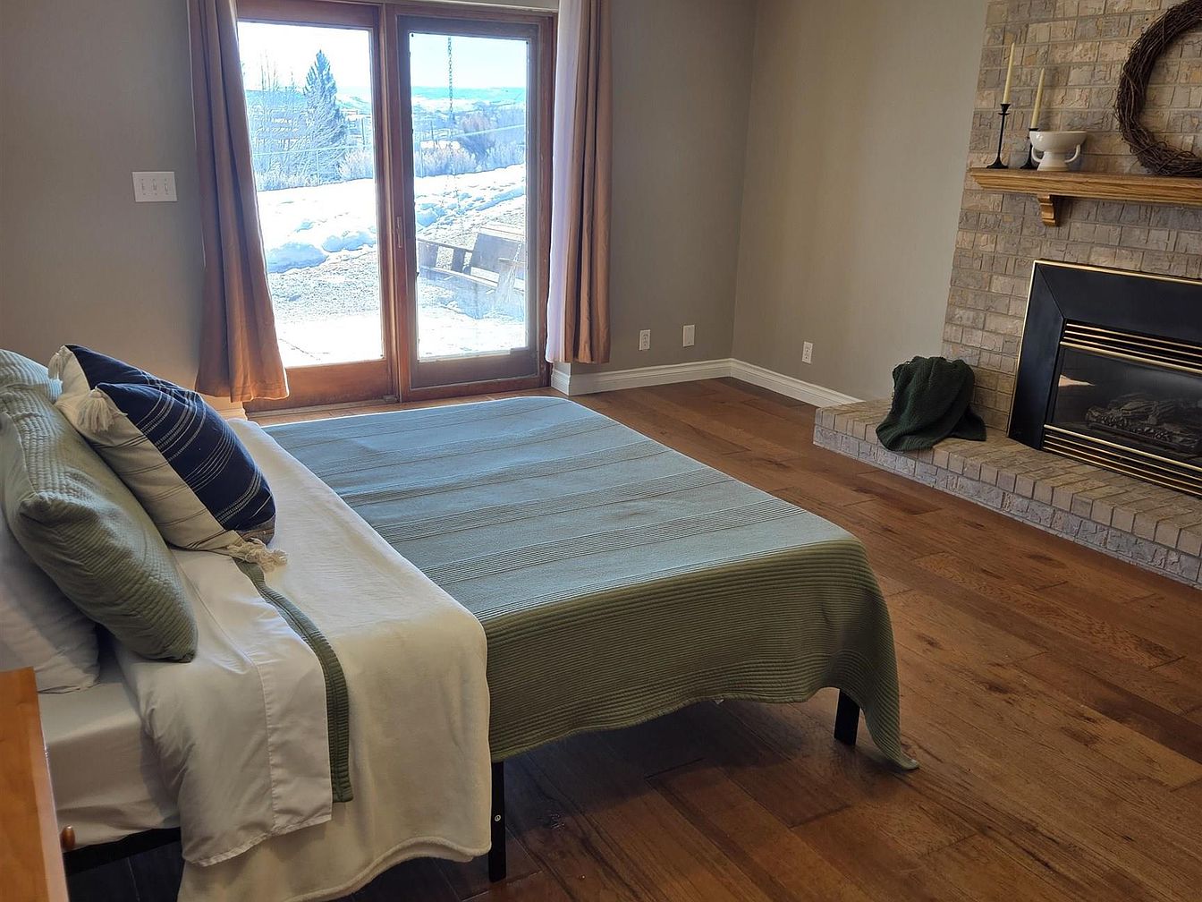 This bedroom exudes warmth and comfort, featuring hardwood flooring that adds natural elegance throughout the space. A gas fireplace with a light brick surround and a wooden mantel serves as a focal point, offering cozy ambiance. The bed is layered with soft bedding in muted green and white tones, with accent pillows in sage and navy blue, enhancing a calm and inviting atmosphere. Floor-to-ceiling glass doors framed in wood open to a snowy outdoor view, allowing ample natural light to brighten the neutral-toned walls and earthy décor, creating a serene retreat.