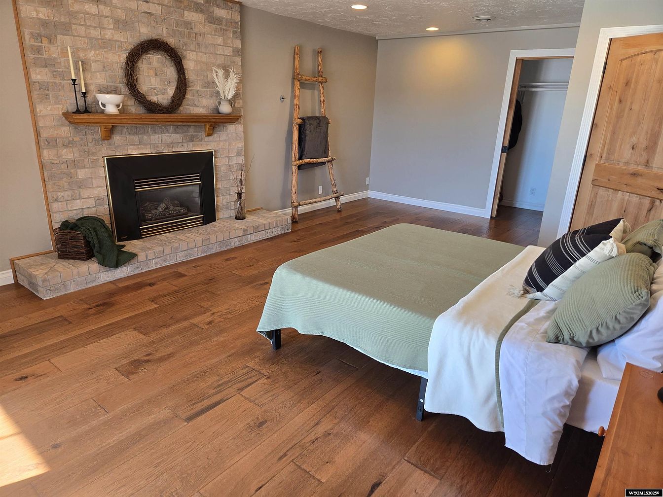 This spacious bedroom features warm hardwood floors and neutral gray walls that complement the natural wood tones of the door and trim. A striking brick fireplace with a wooden mantel serves as a cozy focal point, adorned with simple decorative elements like candles, a twig wreath, and white ceramic pieces. Adjacent to the fireplace is a rustic wooden ladder used as decor, adding character and texture. The bed is dressed in natural fabrics with muted green and cream bedding, enhancing the room’s calming, earthy palette. The open closet door reveals additional storage space, maintaining a clean and inviting atmosphere.