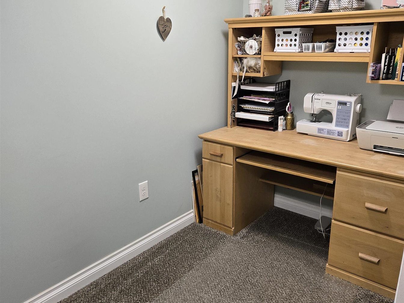 This compact home office corner showcases a built-in wooden desk with a natural finish, featuring multiple drawers and an open under-desk area for legroom or storage. Above, shelving provides organized spaces for documents, office supplies, and crafting tools, including a sewing machine that hints at a multifunctional workspace. The neutral-toned carpet complements the light grey walls, creating a calm, focused atmosphere. Minimal decoration with a small hanging wooden heart adds a subtle personal touch. Clean lines and practical design emphasize functionality while maintaining cozy, inviting aesthetics ideal for productivity and creative projects.