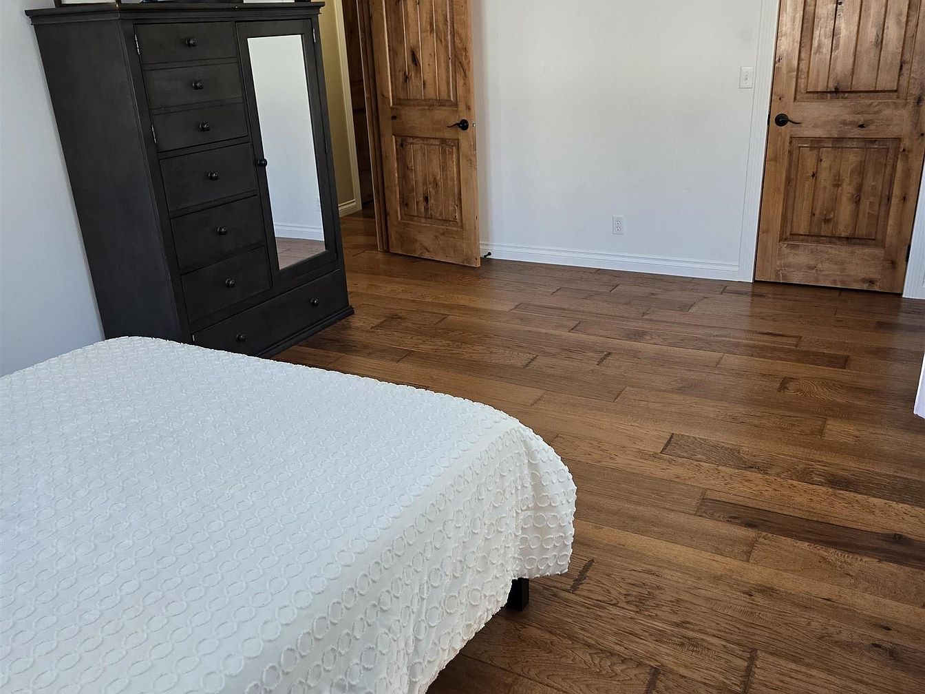 This section of the bedroom highlights elegant hardwood flooring with warm, natural wood grain tones that complement the solid wood doors with rustic finishes. The walls are painted in a crisp white, enhancing the room’s spacious and clean feel. A black dresser with multiple drawers stands tall, featuring a central full-length mirror. The bed, partially visible, is dressed in a textured white blanket with a subtle circular pattern, contributing softness to the space. The overall design balances modern simplicity with earthy, natural elements for a cozy and refined atmosphere.