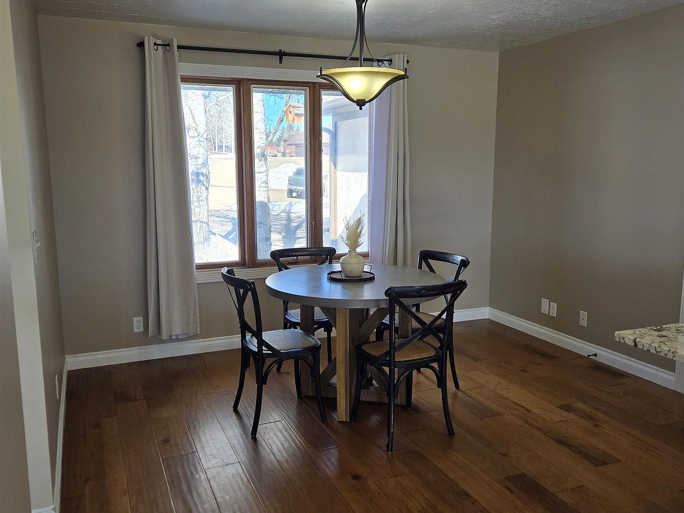 This intimate dining area features a round wooden table with a natural finish, surrounded by four black cross-back chairs with woven seats. The space is anchored by warm, medium-toned hardwood flooring, which adds richness and character. A large window framed with wooden trim brings in ample natural light, brightening the taupe-colored walls. Light beige curtains softly frame the window, complementing the neutral palette. Above, a contemporary pendant light with a frosted glass shade hangs, providing gentle illumination. The overall design balances rustic charm with modern simplicity, creating a welcoming spot for meals or relaxed conversation.