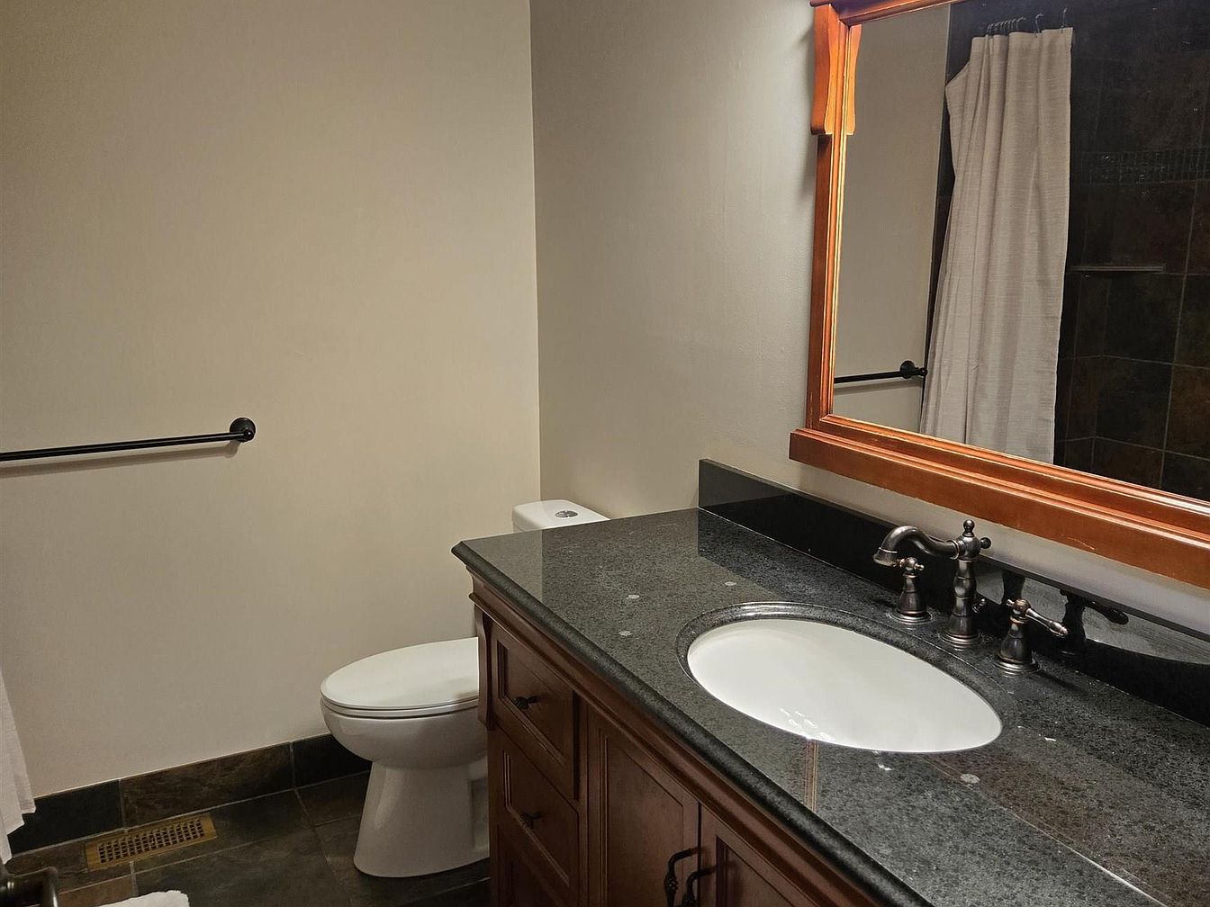 This bathroom features a dark granite countertop with a built-in oval white sink, resting on a rich wooden vanity offering ample storage with multiple drawers and cabinets. A large wood-framed mirror above the sink enhances the space, complementing the warm tones of the vanity. The flooring is composed of dark tiles that extend to the shower area, partially visible with a beige shower curtain. The neutral beige walls create a clean and subtle backdrop, while dark metal fixtures, including a towel bar and faucet, add a modern contrast to the classic design.