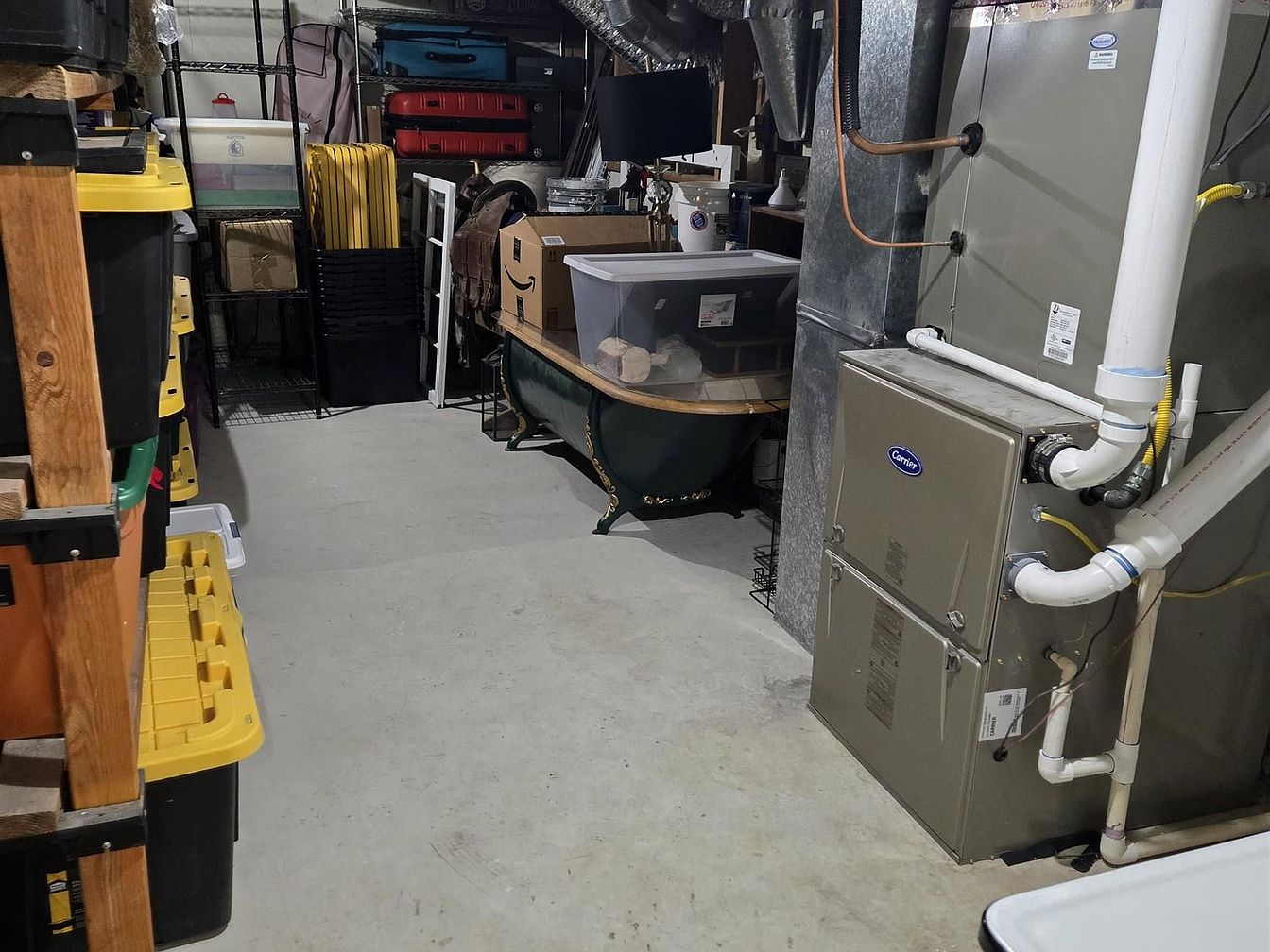 This basement space combines practical storage and functional utility. On the right side, a modern Carrier HVAC system is installed with visible ductwork and white PVC piping, indicating an efficient climate control setup. The left and back walls feature metal and wooden shelving units filled with organized plastic bins in bright colors such as yellow and orange, suggesting a focus on tidiness and accessibility. An ornate vintage-style bathtub repurposed as a storage surface holds additional containers and boxes, juxtaposing industrial utility with a touch of unique character. The flooring is plain concrete, typical of basement spaces, enhancing durability and easy maintenance.