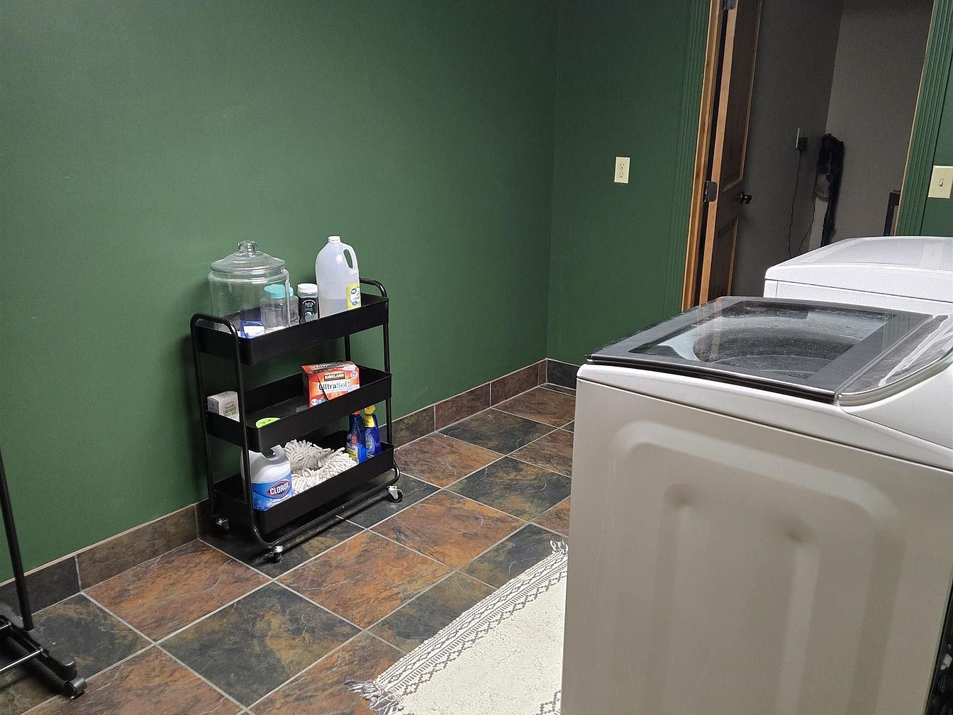 This laundry room features deep green walls that add warmth and richness to the space, complemented by large, multicolored slate floor tiles in earthy tones of brown, gray, and rust. The room includes a white top-loading washing machine with a glass lid, positioned near an open wooden door leading to an adjacent room. A practical black rolling cart with three shelves holds cleaning supplies, detergents, and a large glass jar, providing both organization and easy access. A fringed, neutral-toned rug adds texture and comfort to the otherwise functional space, balancing utility with subtle coziness.