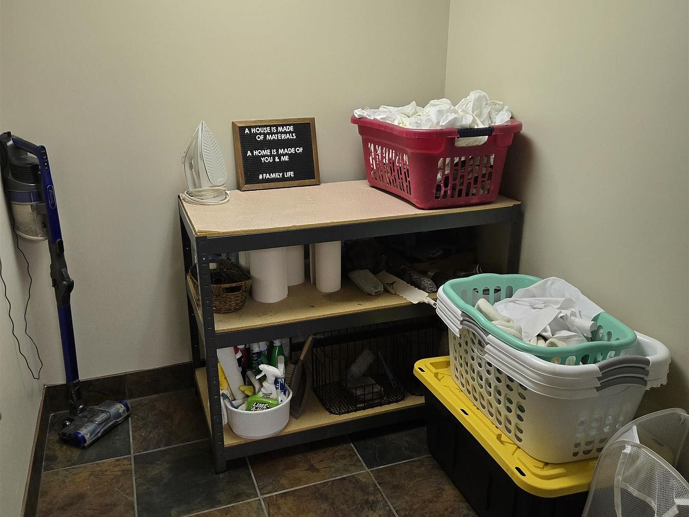 This compact laundry area features a sturdy metal shelving unit topped with a simple wooden board. On the top shelf, an iron and a framed inspirational quote add a personal touch. The shelves hold essential supplies including paper towels and cleaning products arranged neatly in baskets. Two laundry baskets filled with white linens sit beside the shelving, ready for sorting or folding. The walls are painted a soft beige, complementing the warm, earth-toned tile flooring. A cordless vacuum rests against the wall, indicating the space’s dual functionality for both laundry and cleaning storage.