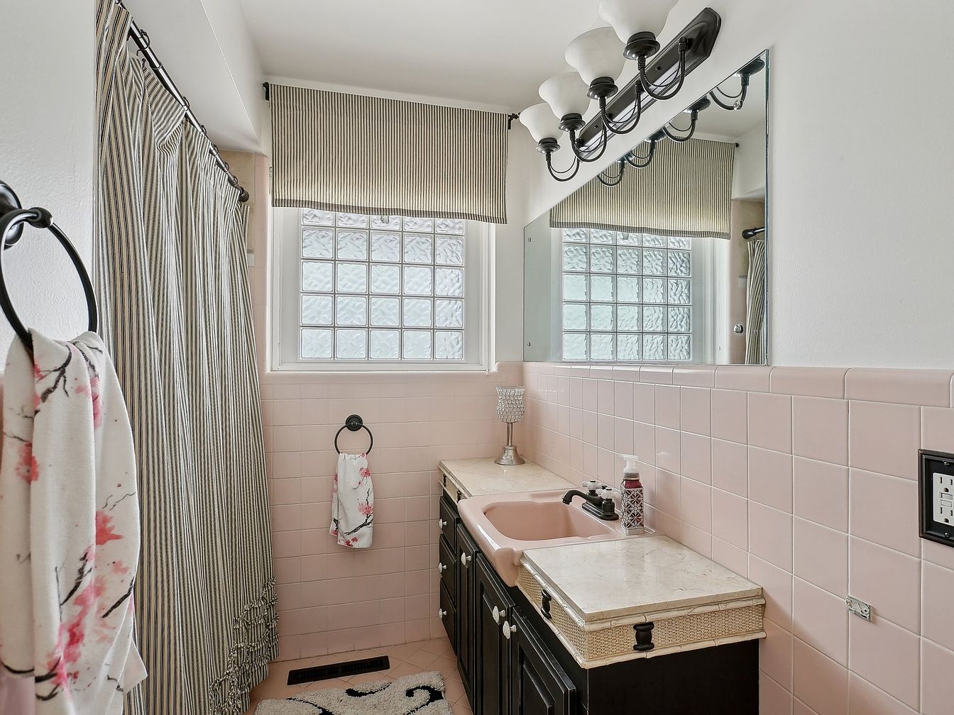 This compact bathroom features a soft pastel pink tile halfway up the walls, paired with a matching pink sink that adds a vintage flair. A large mirror stretches across the vanity, enhancing the sense of space and light, complemented by a classic black light fixture with frosted glass shades above. The vanity cabinet is painted black with white knobs, contrasting nicely with the countertop’s neutral light beige texture, which includes a woven basket element for added texture. Adjacent to the vanity is a shower area with a beige-and-brown striped curtain, softened by a matching window valance over the glass block window that diffuses natural light. The black towel rings hold floral-patterned hand towels, adding a subtle pop of color to the serene, classic design scheme.