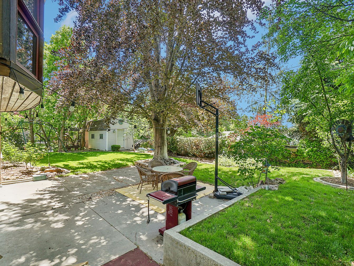 This inviting backyard patio features a spacious concrete area perfect for outdoor gatherings. A circular wicker table with four matching chairs is positioned under the shade of a large, leafy tree, offering comfort and a natural ambiance. Adjacent to the seating area is a portable grill, ideal for cookouts. The lush green lawn surrounds the patio, bordered by dense shrubbery and various trees that add privacy and a sense of tranquility. A basketball hoop stands nearby, suggesting family-friendly recreation. String lights draped overhead contribute to a warm and cozy atmosphere in the evenings.