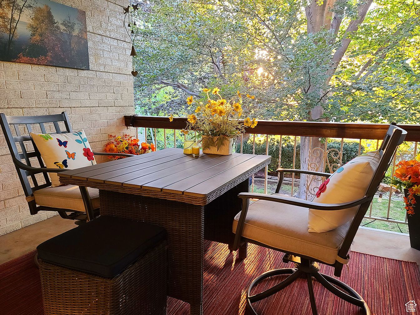 This charming balcony area features a warm, inviting seating arrangement centered around a rectangular, woven rattan table with a smooth wooden top. Two cushioned swivel chairs with black frames are accented with cheerful throw pillows adorned with colorful butterflies and flowers, offering comfort and a touch of whimsy. The space is grounded by a deep red outdoor rug, complementing the natural color palette of beige, brown, and green. Surrounded by lush trees and bathed in golden sunlight, the balcony’s brick wall is softly decorated with an autumn-themed painting and seasonal floral arrangements, creating a serene retreat blending nature and cozy home aesthetics.