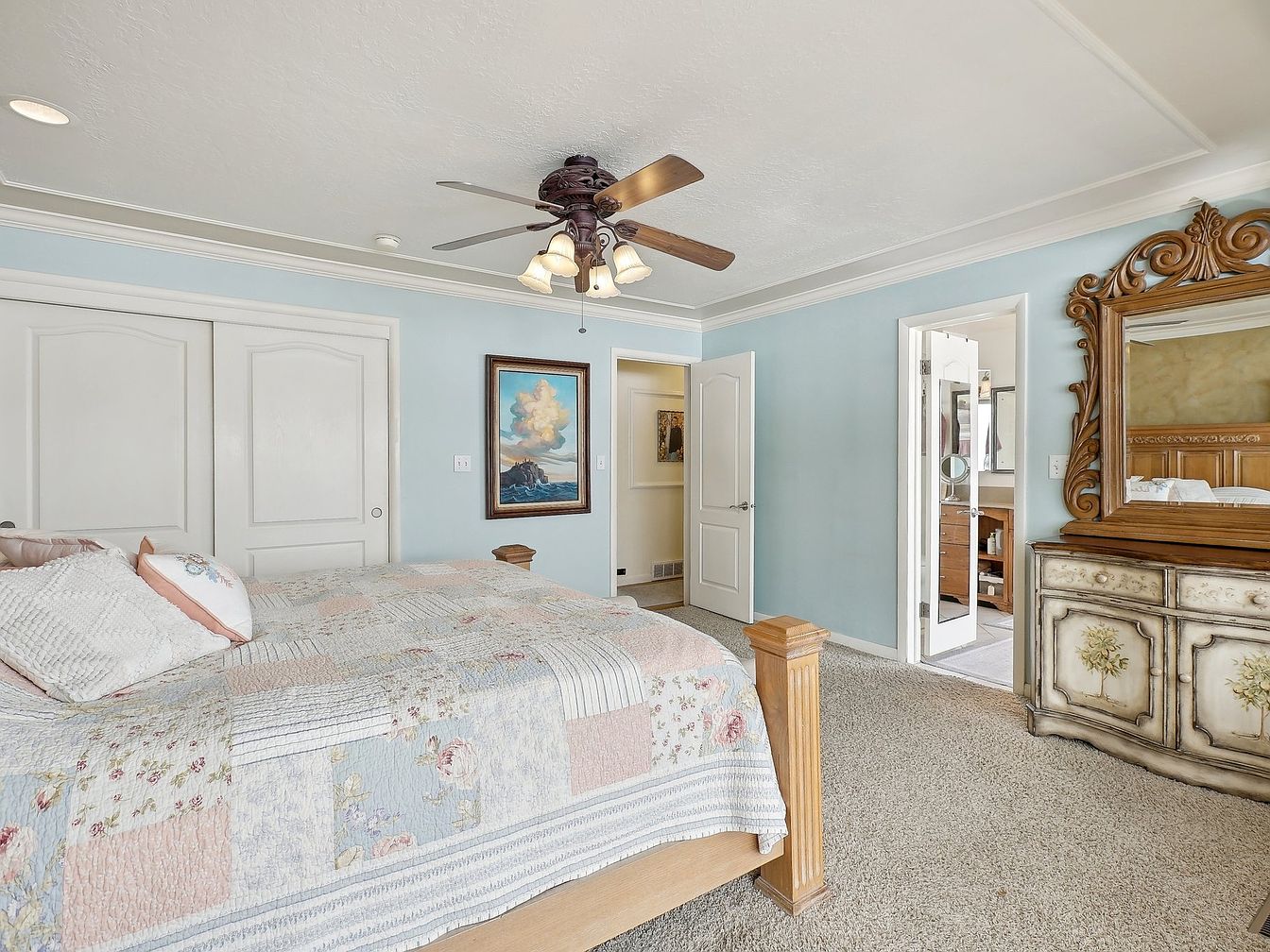 This master bedroom features soft blue walls contrasted by white trim and doors, creating a serene and airy ambiance. A wooden bed with quilted bedding in pastel floral patterns anchors the space, inviting comfort. A vintage-style dresser with intricate floral detailing and a large, ornately carved frame mirror adds classic charm. The carpeted floor amplifies the cozy feel while a ceiling fan with wood blades and soft lighting provides functional elegance. Art on the wall adds a touch of personality, and open doorways lead to adjoining rooms, enhancing flow and accessibility.