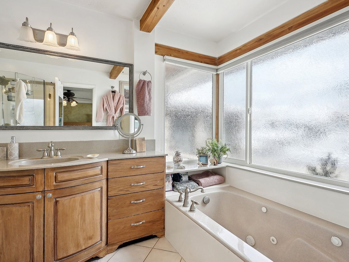 This bathroom features a warm and inviting design with natural wood accents and neutral tones. The vanity has a curved wooden cabinet with multiple drawers, topped by a beige countertop housing a single under-mount sink. Above it is a large, rectangular mirror framed in dark wood with three-light fixtures. Adjacent is a spacious soaking tub with silver fixtures, bordered by a broad ledge displaying decorative touches like a small plant and bottles. The large textured windows let in diffused natural light, creating privacy while brightening the space. Exposed wooden beams add rustic charm to the otherwise clean and airy room.